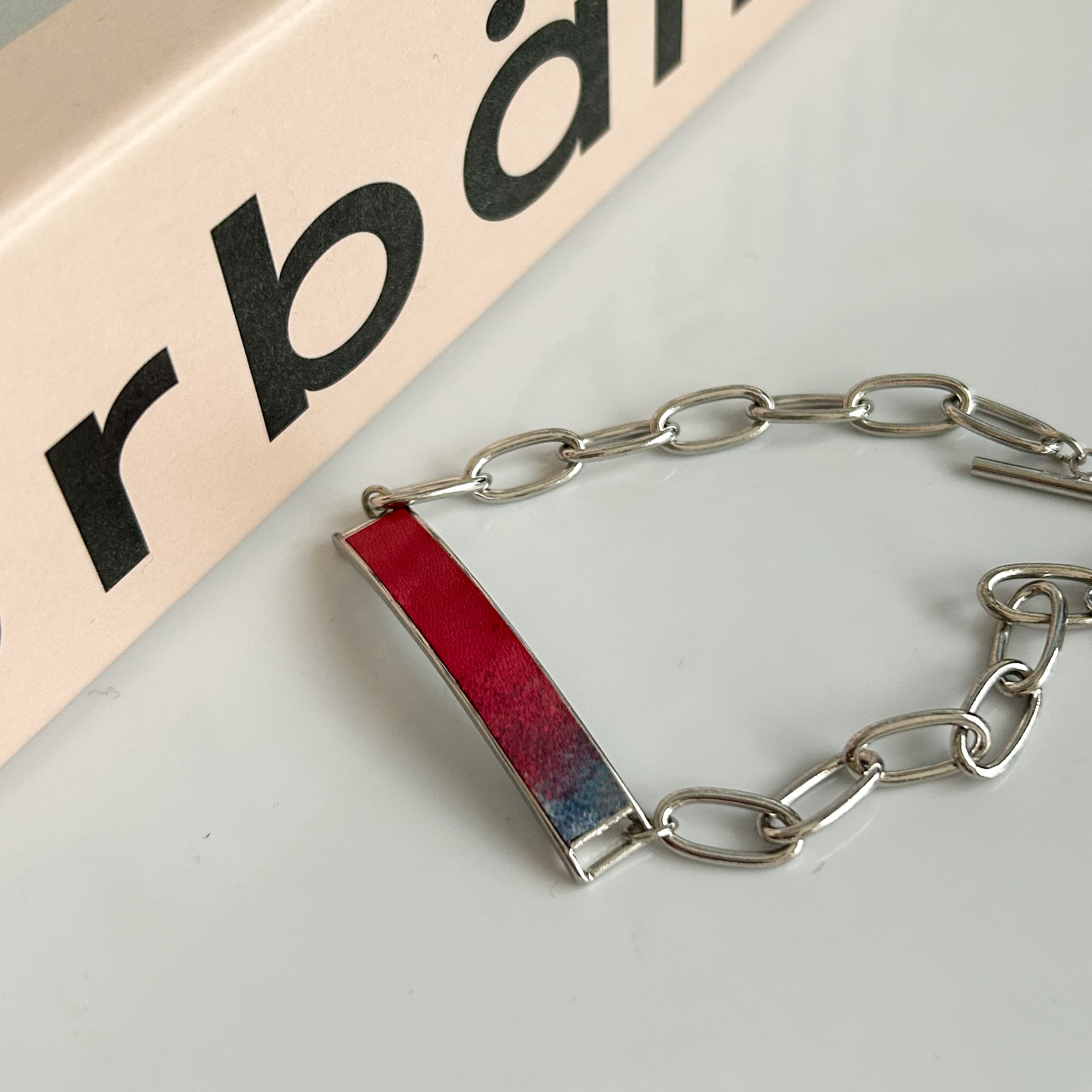 手染めレザーブレスレットと金属のチェーンが絶妙に組み合わさったおしゃれなアクセサリーです。手染めのレザーが独特の風合いを生み出し、香るアロマが漂う程よい熟成感が魅力の一つ。男女を問わず、様々なスタイルにマッチするデザインです。